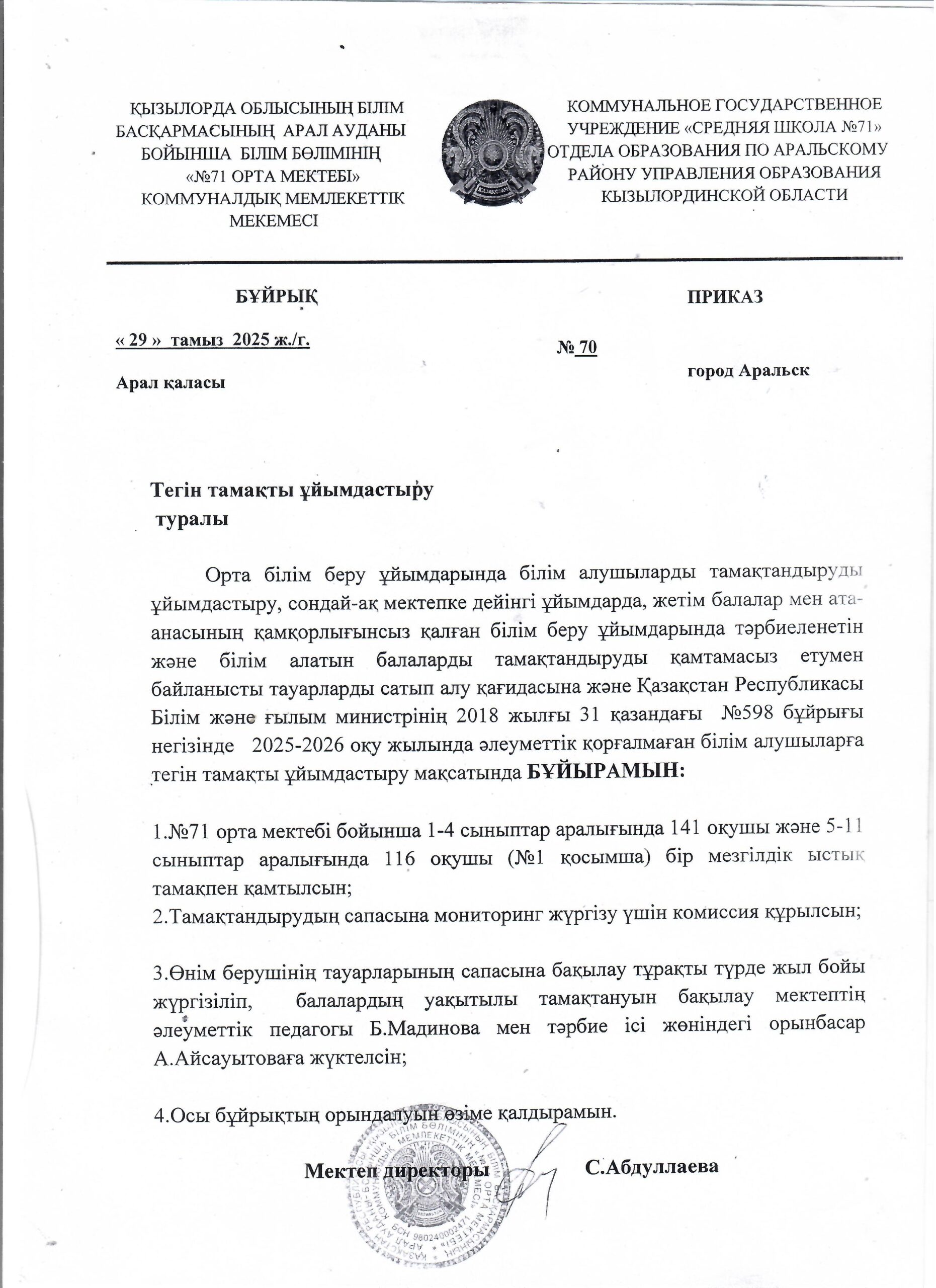 "Қызылорда облысының білім басқармасының Арал ауданы бойынша білім бөлімінің "№71 орта мектебі» КММ